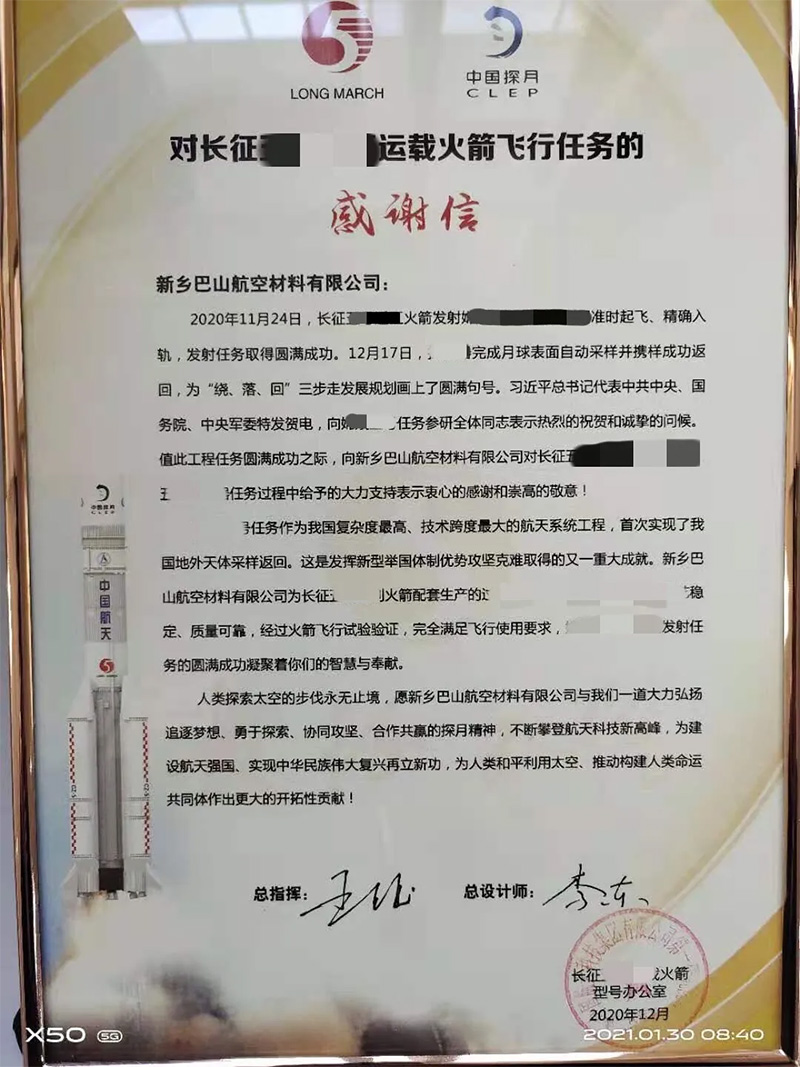 近日,新鄉(xiāng)巴山航空材料有限公司收到運(yùn)載火箭型號(hào)辦公室發(fā)來(lái)的感謝信,信中對(duì)我公司為某運(yùn)載火箭飛行任務(wù)做出的貢獻(xiàn)表達(dá)了感謝。